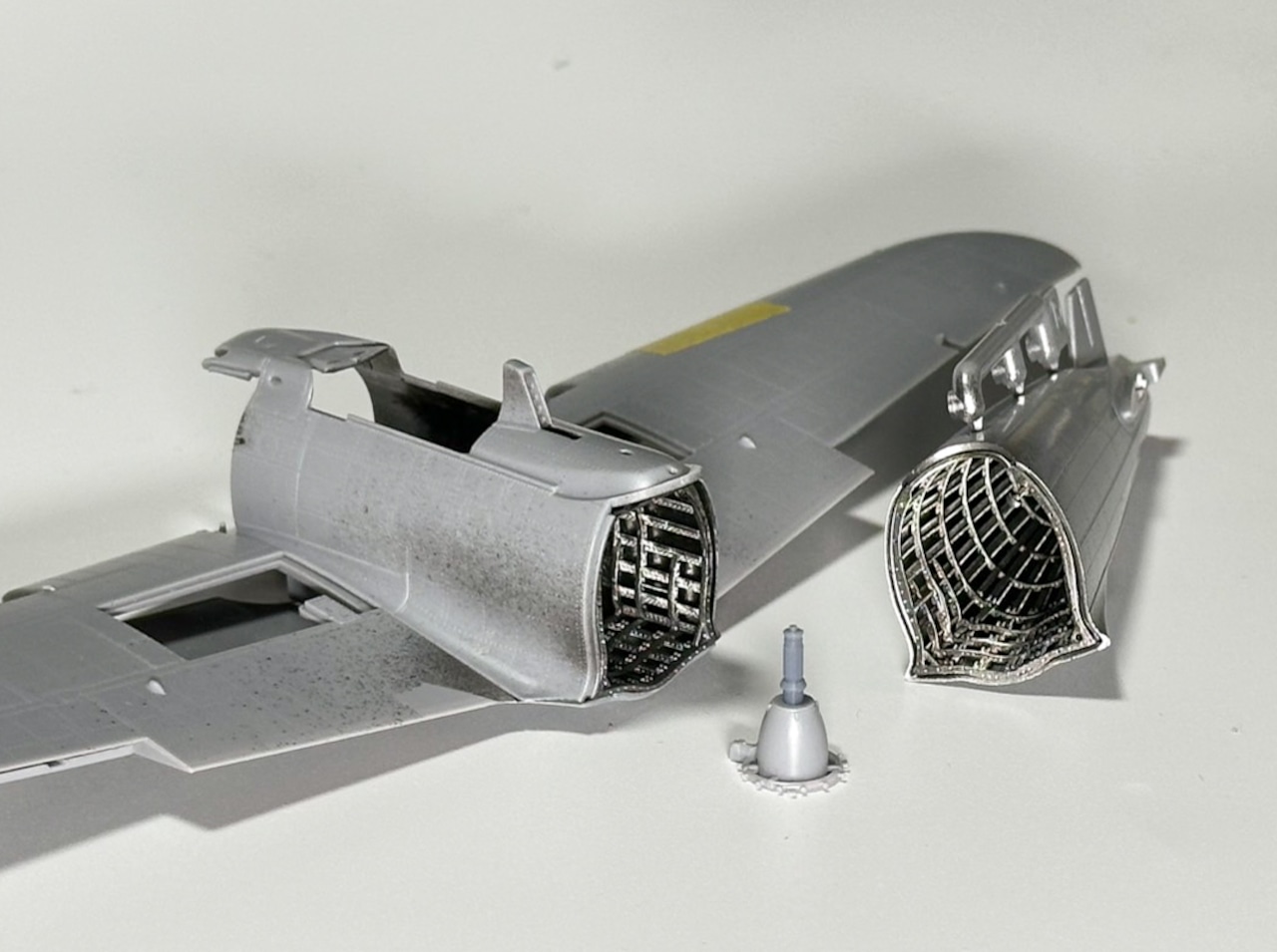 胴体前後のパーツとプロペラを取り外した状態を再現出来るシャフトのパーツが付属します。