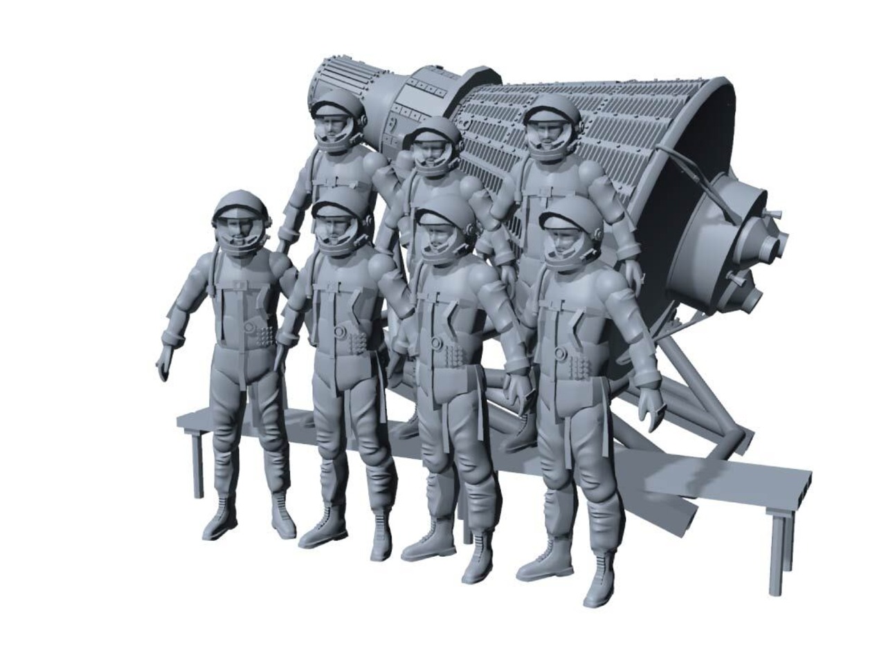 マーキュリーカプセル、ドーリー、7人の宇宙飛行士を3Dプリントで精密に再現