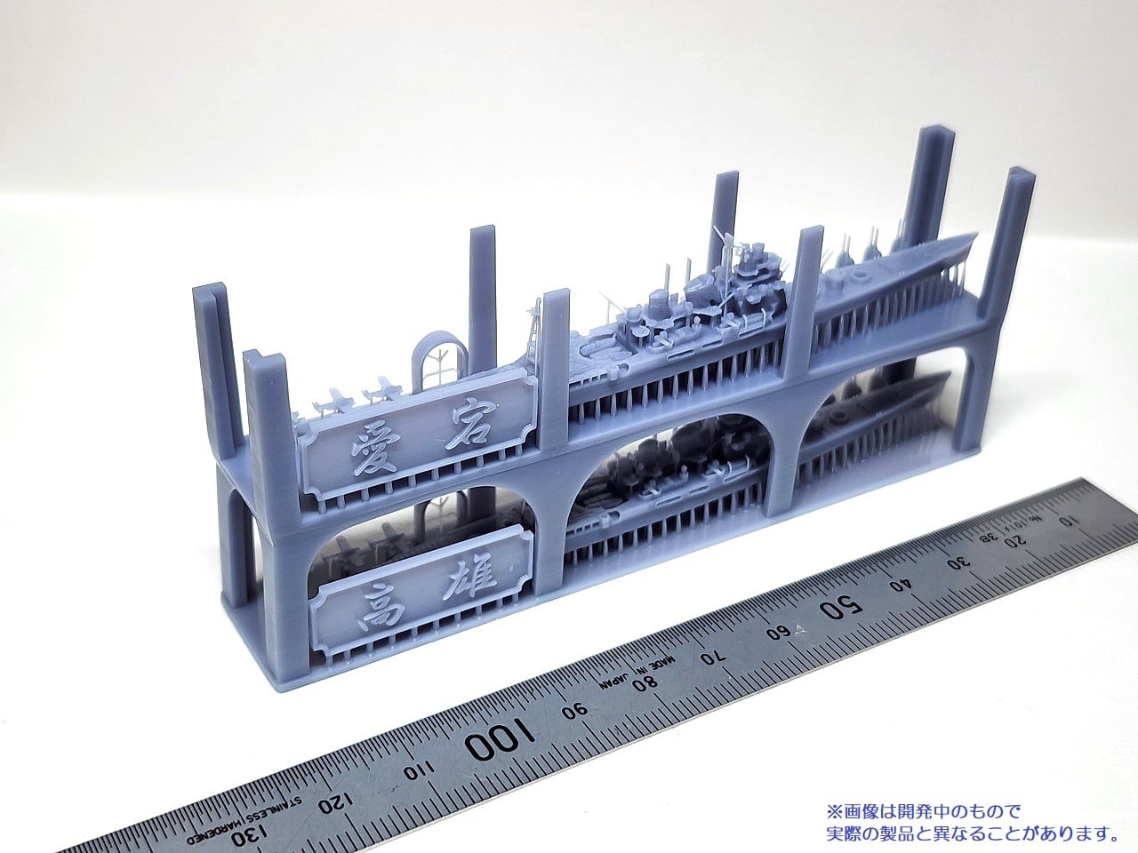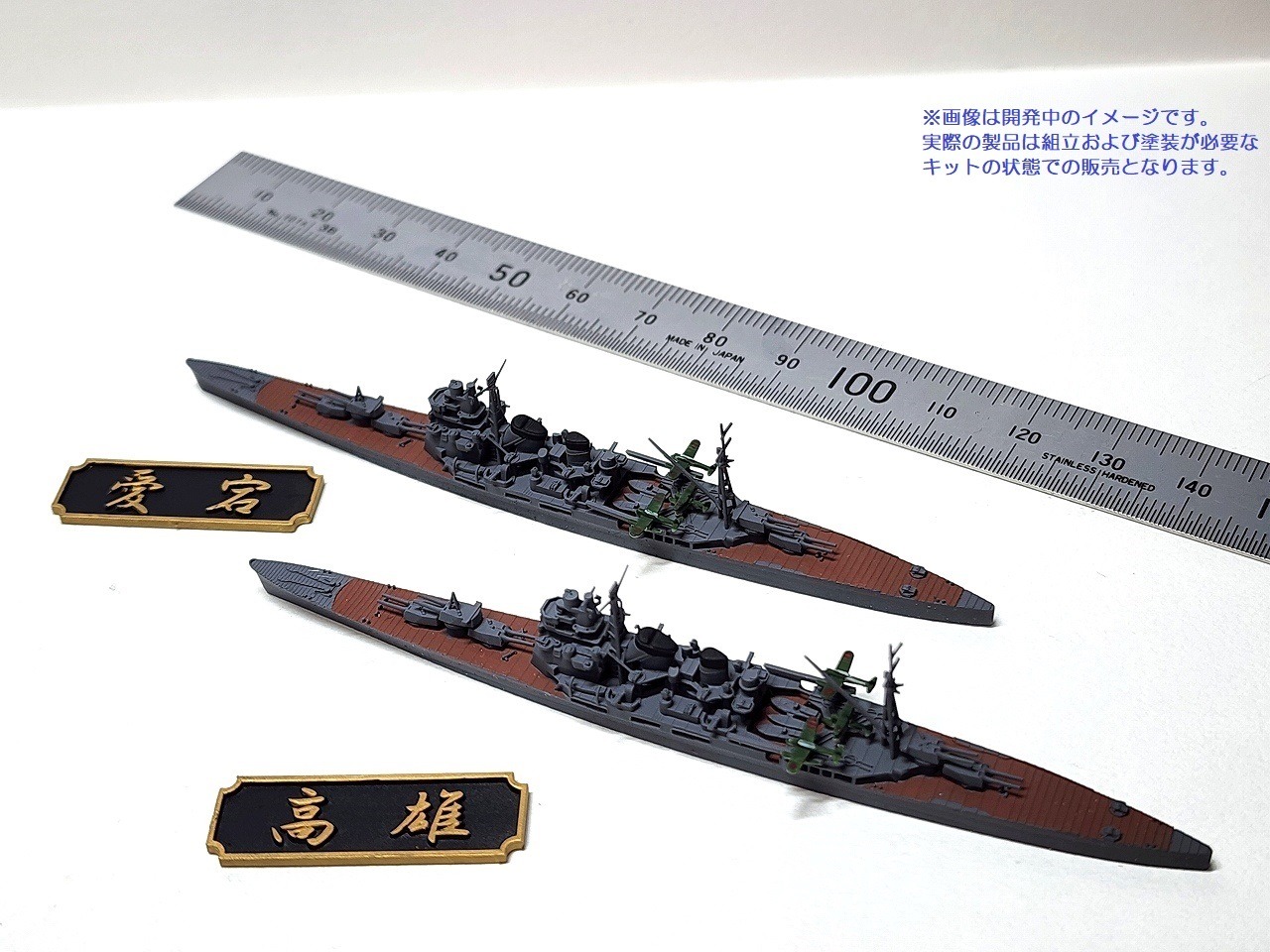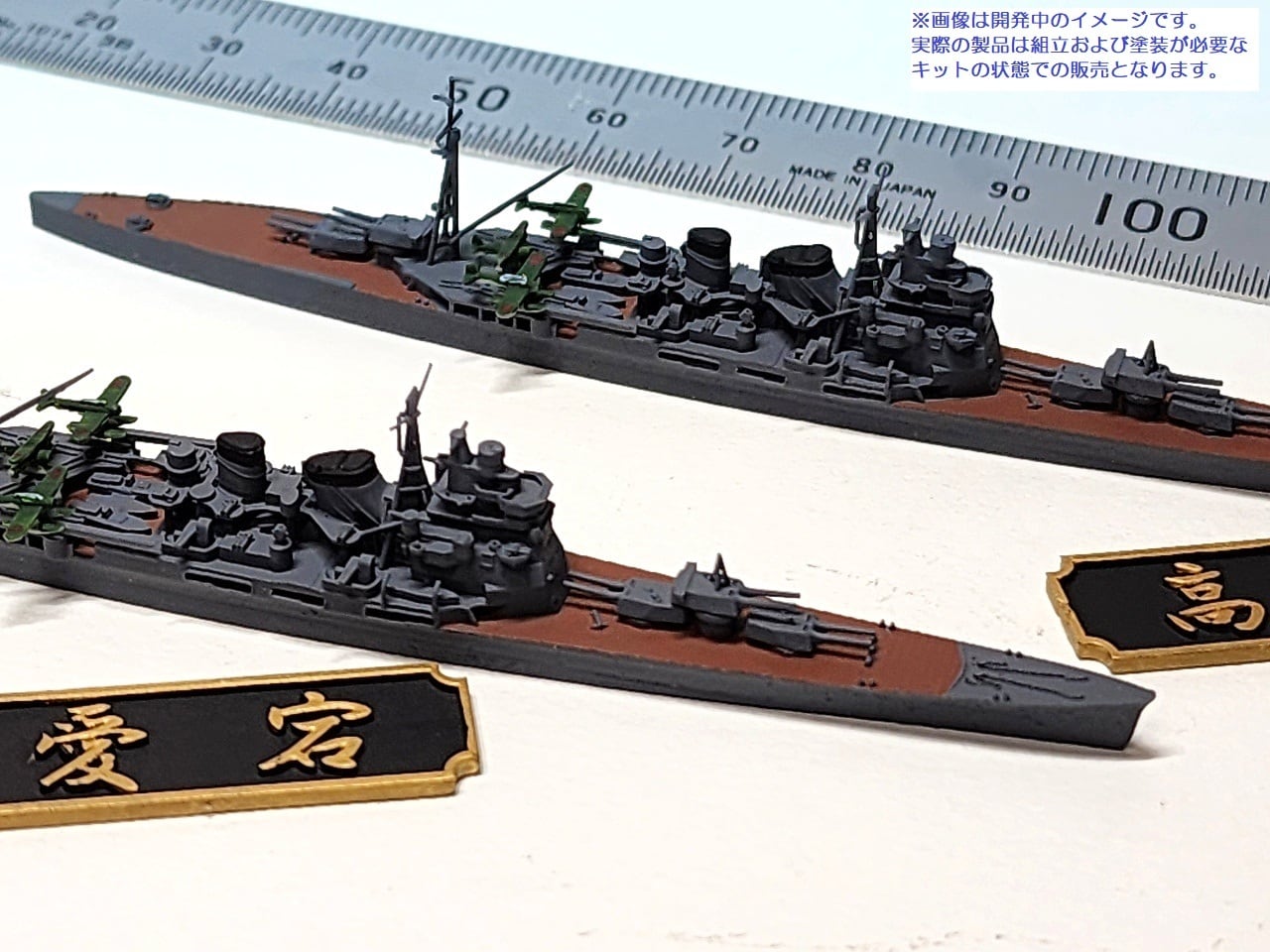 精密に3Dプリントされた2隻の重巡洋艦のウォーターラインモデルに艦名の銘板が付属します。
