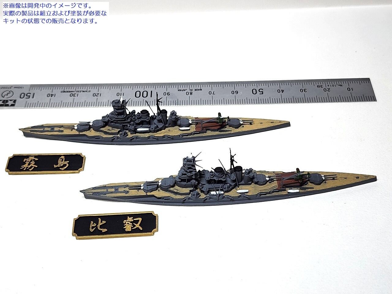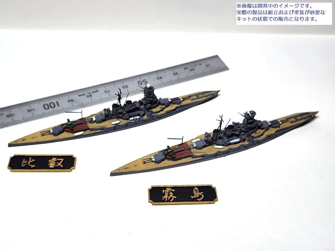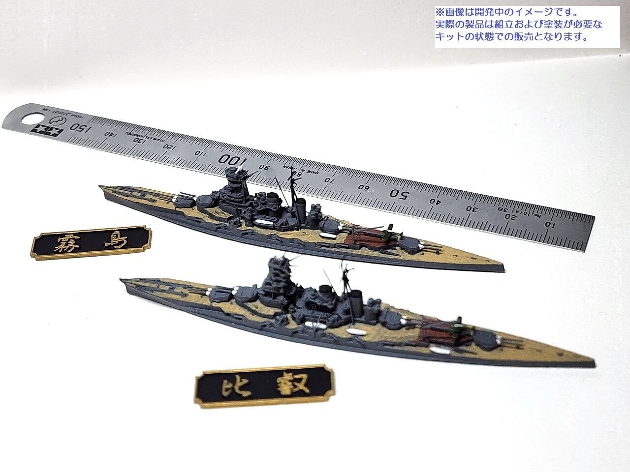 精密に3Dプリントされた2隻の戦艦のウォーターラインモデルに艦名の銘板が付属します。