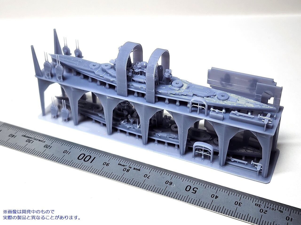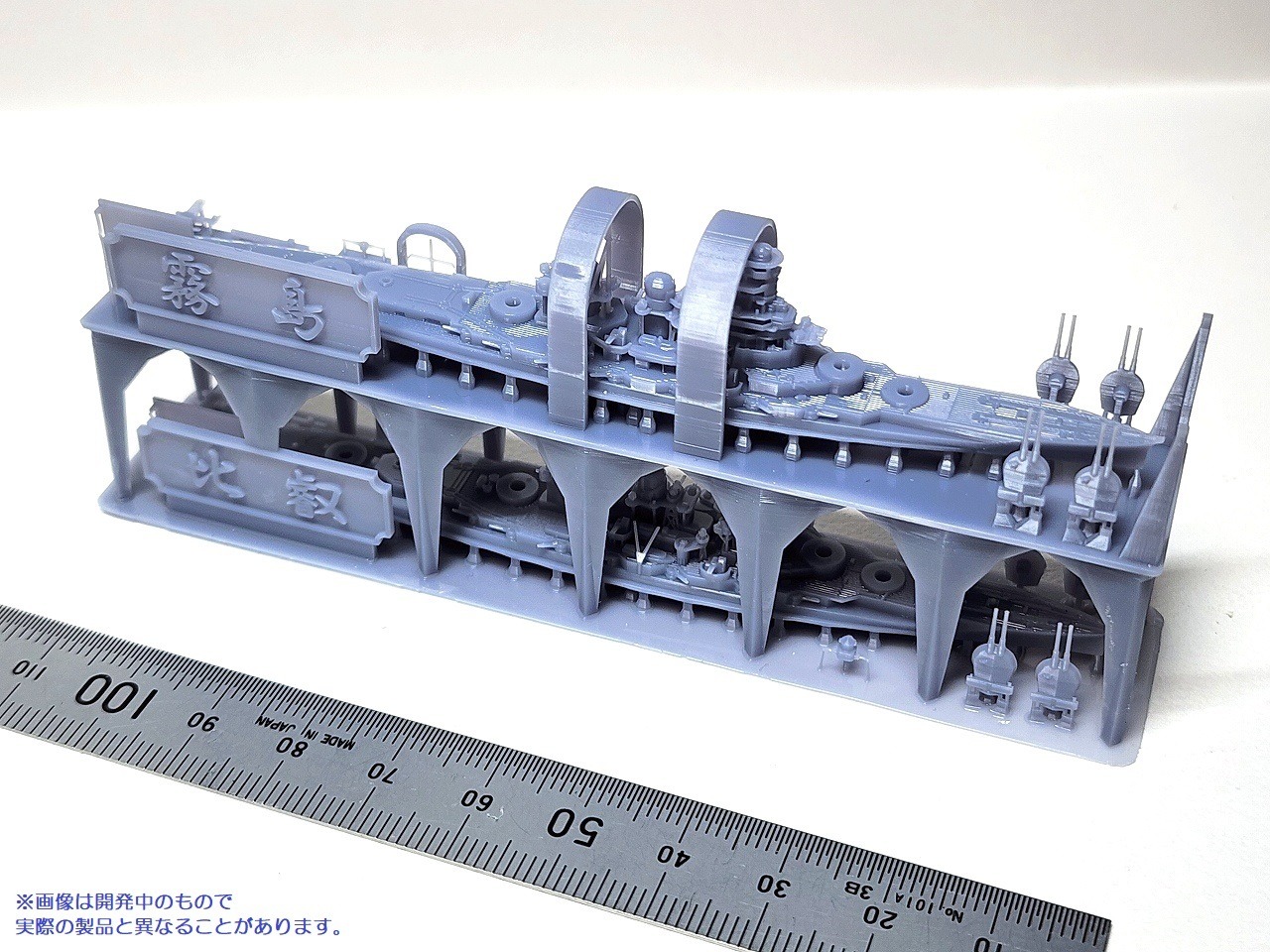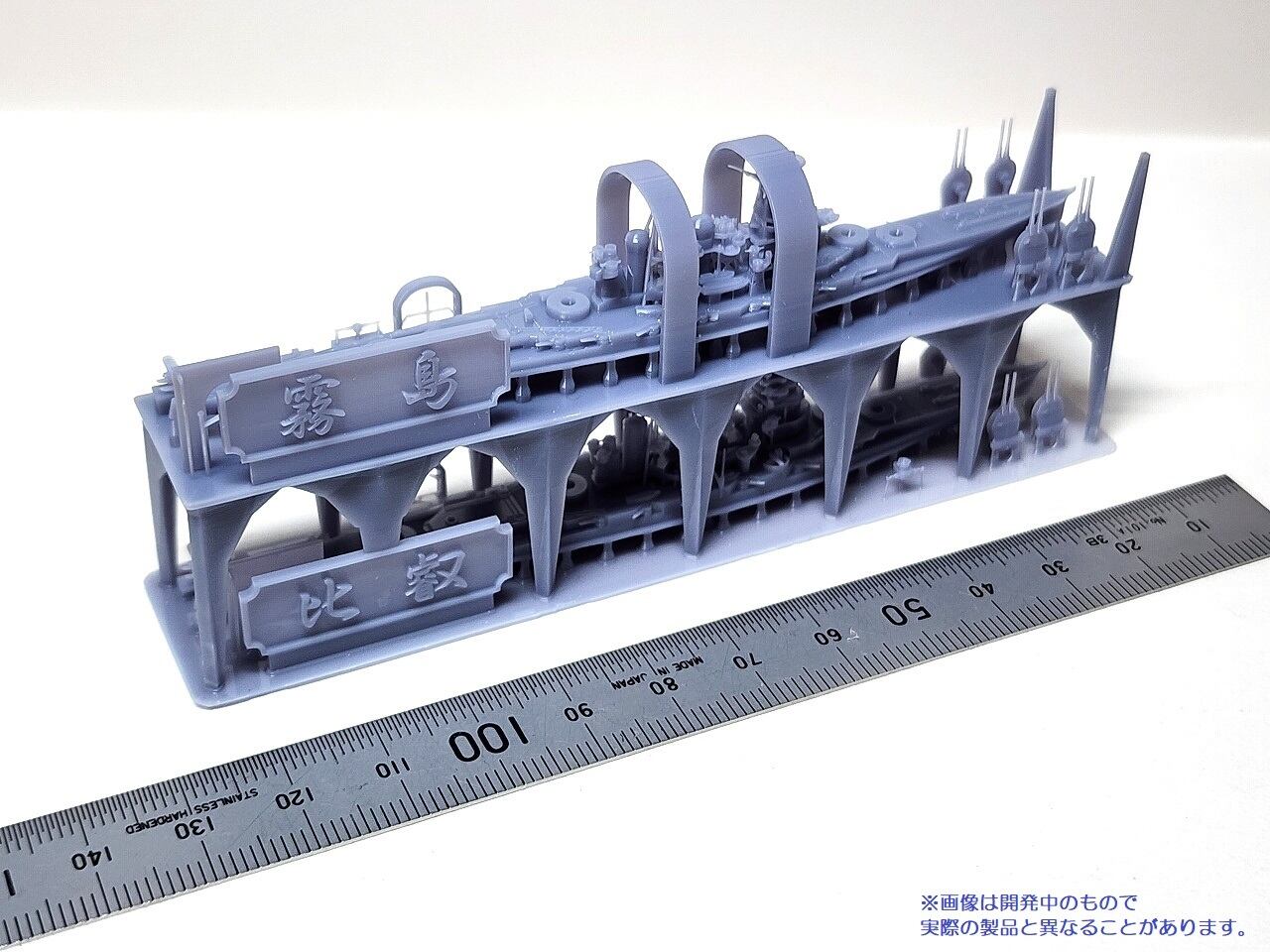 精密に3Dプリントされた2隻の戦艦のウォーターラインモデルに艦名の銘板が付属します。