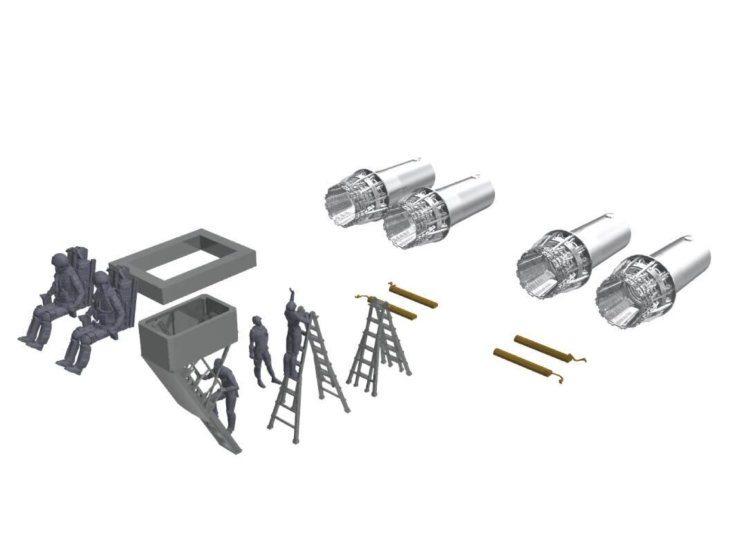 精密なノズルやパイロット、シートに加えて乗降ラダーやメンテナンス機材とフィギュアを豊富にセットしました。