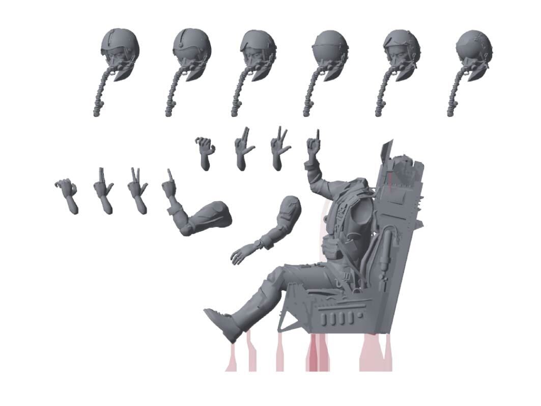 1/48 F-2用パイロットフィギュア、ヘッドパーはヘルメット違い/バイザー開閉で6種付属、ハンドパーツは各部隊のハンドシグナルを模した4種付属。